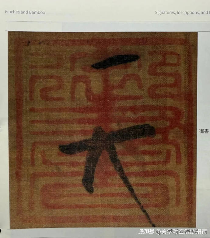 竹禽圖畫面上有“天下一人“簽押,鈐“御書”印。這件作品的一些細(xì)節(jié)與趙佶親筆畫《柳鴉蘆雁圖》(上海博物館藏)中的柳鴉部分非常接近,再加上落款是趙佶真跡,因此,可以認(rèn)為這件作品是可信的趙佶親筆繪畫。