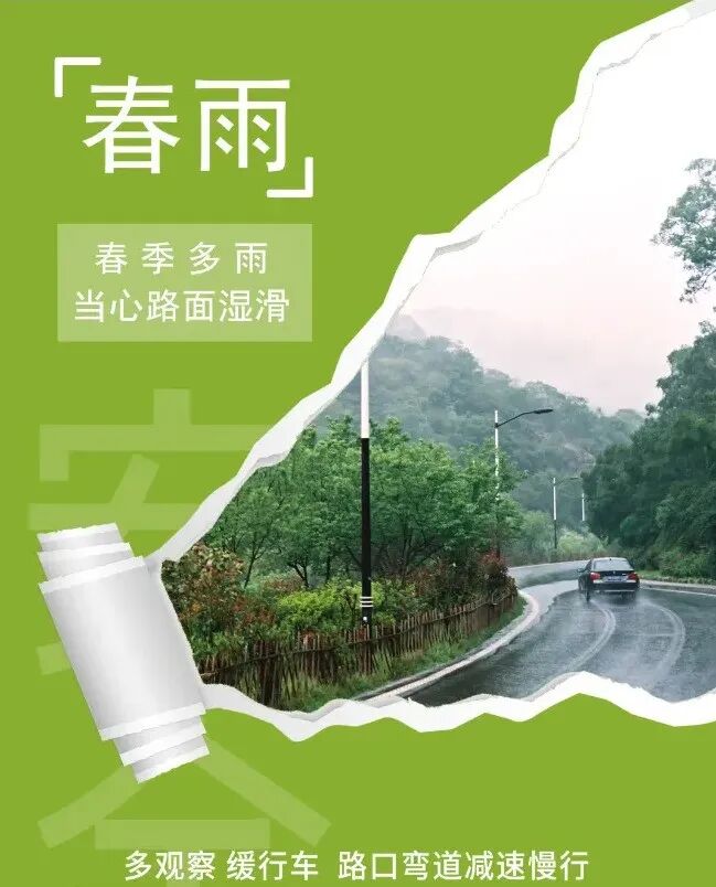 1、春季多雨,雨后道路濕滑,輪胎附著系數(shù)下降,行車時應(yīng)注意觀察路況,加大行車間距,減速緩慢行駛!