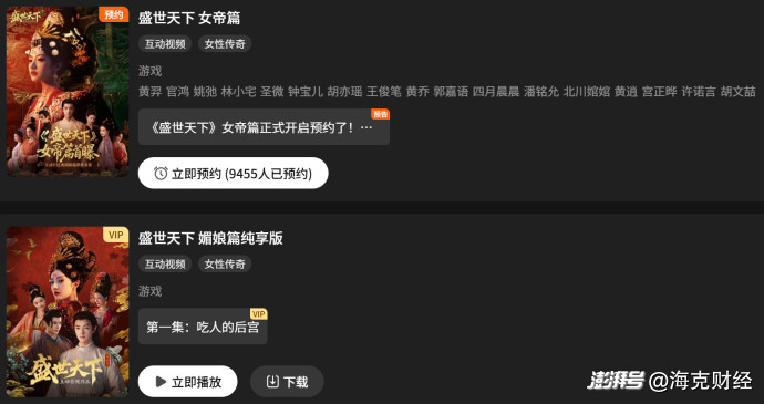 據(jù)??素?cái)經(jīng)觀察,此前真人實(shí)拍的互動游戲《盛世天下》曾引發(fā)大眾對這種內(nèi)容形式的關(guān)注。這一2025年9月上線的互動游戲,在安卓、Steam等平臺的售價(jià)為39元,官方數(shù)據(jù)顯示發(fā)售12天,全球銷量就超過100萬套。游戲中,用戶扮演主角武元照,通過不同選項(xiàng)推動劇情發(fā)展,在唐代宮廷中步步為營。該游戲制作人Demi公開表示,《盛世天下》的劇本超過30萬字,素材時(shí)長1200分鐘,有幾十種不同結(jié)局,制作周期近1年。