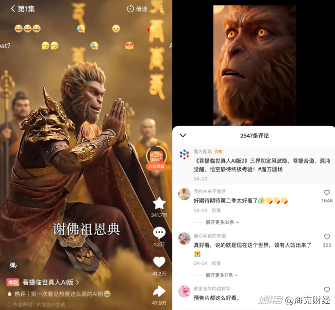 《菩提臨世》改編自小說《西游記:菩提祖師下山》,講述孫悟空含冤而死,六耳獼猴頂替了孫悟空成為斗戰(zhàn)圣佛,菩提祖師因此下山踏碎靈山佛國,復(fù)活孫悟空后師徒聯(lián)手報(bào)仇的故事。該劇共60集,每集時(shí)長約2分鐘,畫面風(fēng)格模擬真人,有不少精彩的打斗場面讓用戶感慨如今AI的強(qiáng)大。目前《菩提臨世》第二部的預(yù)約人數(shù)已超過230萬。