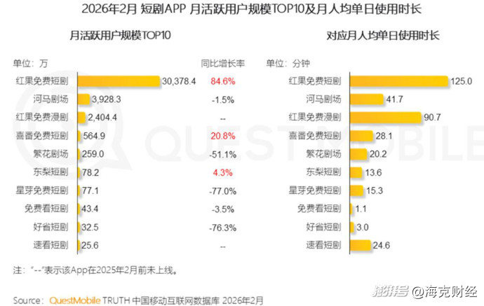據(jù)QuestMobile數(shù)據(jù),2026年2月,在微短劇APP的MAU排行榜上,紅果短劇以3.03億排名第一,同比增長84.6%,其后為河馬劇場(3928.3萬)、紅果漫?。?404.4萬)、喜番短?。?64.9萬);而從月人均單日使用時(shí)長來看,紅果漫劇僅次(90.7分鐘)于紅果短?。?25分鐘),遠(yuǎn)超河馬劇場(41.7分鐘)、喜番短?。?8.1分鐘)等。