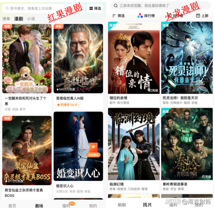 微短劇中,漫劇比真人劇有更為特殊的生態(tài)位。漫劇源于漫畫,屬于二次元文化。部分漫畫平臺原本就設(shè)有動態(tài)漫畫這一分類,在漫劇浪潮到來以后直接改為漫劇,比如騰訊動漫就有漫劇頁面。主流的微短劇平臺普遍兼有真人劇與漫劇,但漫劇又能夠擁有獨(dú)立的用戶心智。因此,字節(jié)于2023年5月推出紅果短劇后,又在2025年3月推出紅果漫劇,騰訊則于2026年2月推出了火龍漫劇。
