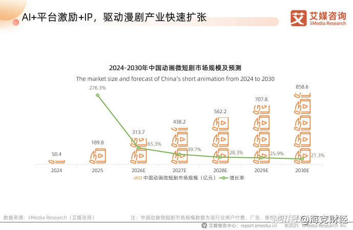 漫劇的市場規(guī)模同樣呈高速發(fā)展態(tài)勢。調(diào)研機(jī)構(gòu)艾媒咨詢數(shù)據(jù)顯示,國內(nèi)漫劇市場規(guī)模2024年為50.4億元,2025年為189.8億元,2026年將達(dá)313.7億元,預(yù)計(jì)2030年可達(dá)858.6億元,5年CAGR(復(fù)合年增長率)為35.2%。