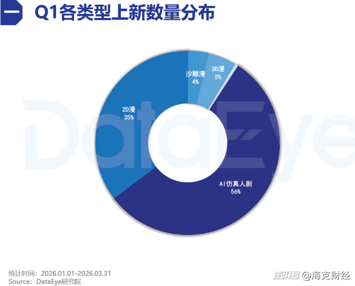 據(jù)DataEye發(fā)布的《2026年Q1 AI劇及漫劇數(shù)據(jù)報(bào)告》,以抖音端為例,2026年以前在播漫劇為5.8萬部,2026年第一季度增長至約18萬部,單3月就新增了約5萬部漫?。?026年第一季度的新增漫劇中,占比最高的類型為AI仿真人劇(56%),2D漫排名第二(35%),其余為3D漫(5%)、沙雕漫(4%)等。