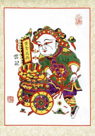 從正式的“周世宗”到民間的“柴王”“柴梁王”,這些不同的稱呼背后,體現(xiàn)了官方和民間對(duì)柴榮認(rèn)識(shí)的差異。不同于“器貌英奇”“性沈重寡言”(《新五代史》卷12《周本紀(jì)》)的帝王威嚴(yán)形象,后世民間的柴王形象,更常見(jiàn)的是戴帽的小商販的樣子,他推著一輛裝滿寶貨的獨(dú)輪車,車上常插著“日進(jìn)斗金”的旗幟。朱仙鎮(zhèn)木版年畫《柴王推車》十分生動(dòng)地描述了柴王的這一形象特點(diǎn)。這幅年畫象征著財(cái)源茂盛、滿載而歸,寓意吉祥,深為廣大人民所喜愛(ài)。
