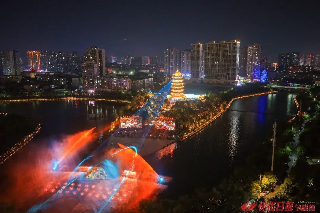 鶴鳴洲以“一河兩岸·鶴鳴福洲”為主題,噴泉、升降LED屏與燈光交織聯(lián)動的沉浸式演出,讓城市的夜晚充滿活力與魅力。(懷化日報(bào)全媒體記者 潘雨 攝