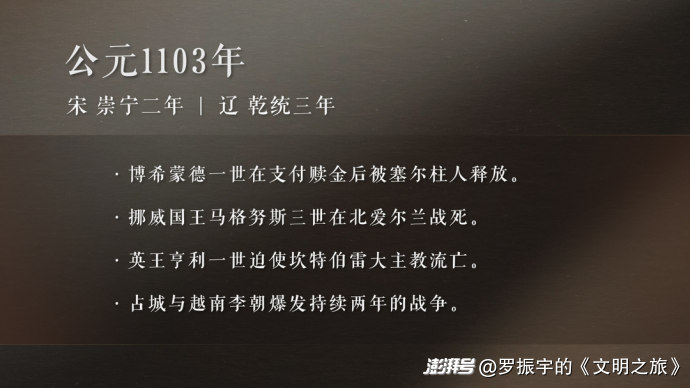 你好,這里是《文明之旅》。歡迎你穿越到公元1103年,大宋崇寧二年,大遼乾統(tǒng)三年。