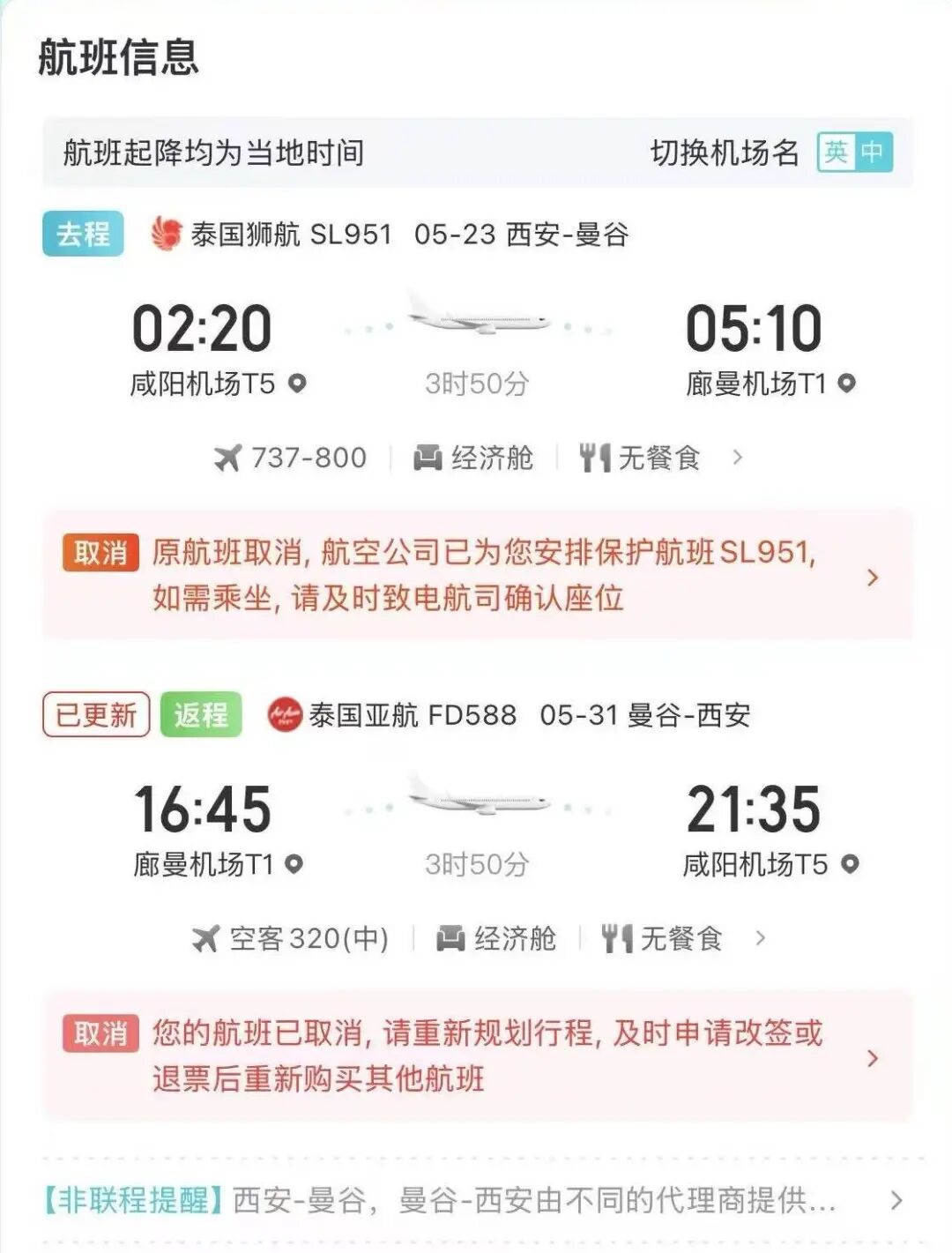 趙華瑞最開始還抱有航班能恢復的期待。他查詢發(fā)現(xiàn),去程航班取消,但回程航班仍在開放售票,因此一度懷疑是信息有誤。直到4月3日,回程航班也被取消,他才徹底放棄等待。上周五,壞消息又來了——5月23日從西安飛曼谷的去程航班也被取消。