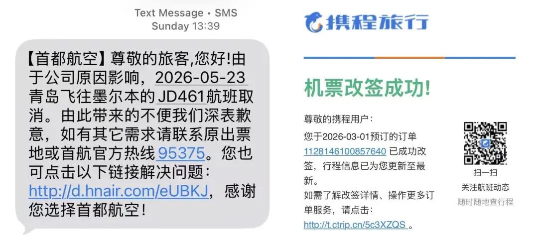 當標準客服通道失效,旅客只能靠“非常規(guī)路徑”自救,或被迫接受不對等的妥協(xié)。22歲的楊昕月持打工度假簽證在墨爾本肉廠做包裝工,半年未歸家。3月初,她以1200元訂下首都航空青島飛墨爾本的返程票。4月19日周日,她在家休息時突然收到取消短信。航司客服熱線一小時未通,她在民航局12326平臺提交投訴。
