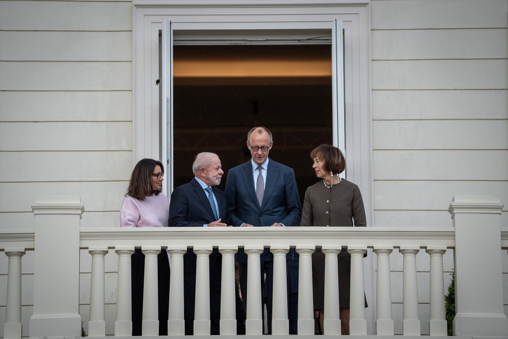 當(dāng)?shù)貢r(shí)間,德國(guó)漢諾威,德國(guó)總理弗里德里?!つ呐c巴西總統(tǒng)路易斯·伊納西奧·盧拉·達(dá)席爾瓦攜夫人夏洛特·默茨(右)和雅尼婭·盧拉·達(dá)席爾瓦(左)在 Herrenhausen Palace 合影。視覺(jué)中國(guó) 圖