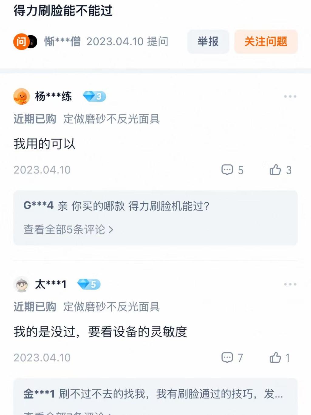 在該商品評論中不少網(wǎng)友詢問,該面具是否能通過打卡器的刷臉打卡,有用戶回答可以,還有人稱不行。商家則回復稱,“有通過的,具體和照片清晰度以及機器識別維度有關?!?/p>