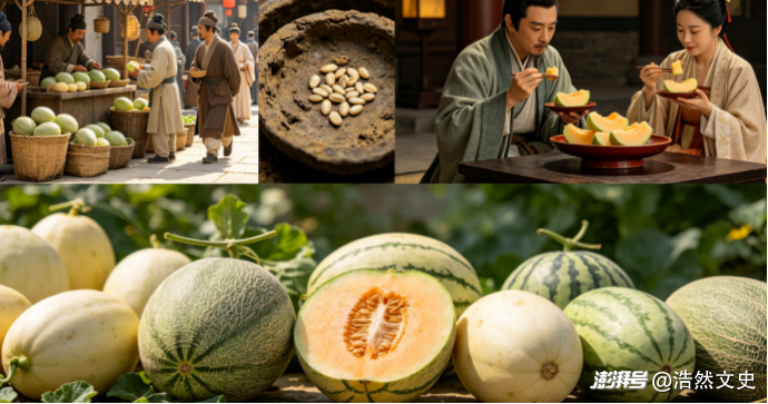 《西京雜記》中記載的漢代棗類有20多種,李類也有十幾種。當(dāng)時(shí)大部分水果都是人工栽培,而且經(jīng)過多年的選種育種,已經(jīng)培育出了一些品質(zhì)優(yōu)良的新品種。比如《西京雜記》里就記載當(dāng)時(shí)的皇家園林上林苑里,有紫梨、青梨、大谷梨等不同品種的梨。甜瓜也是漢代人非常流行的水果。秦東陵侯召平在秦亡后淪為貧民,在長安東種瓜,因瓜果甜美而出名,世稱“東陵瓜”。貧民種瓜通常就在市場(chǎng)上銷售,可見這是普通人也能消費(fèi)的水果。另外考古學(xué)者在?;韬顒①R和馬王堆漢墓轪侯夫人的遺體中,也都發(fā)現(xiàn)了未消化的甜瓜子。可見在漢代,甜瓜是一種從平民到貴族都能消費(fèi)的水果。