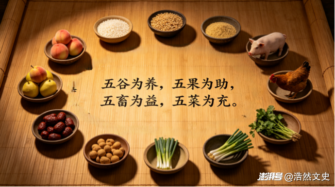 人類從采集漁獵時(shí)代走來,最早的食材實(shí)際上是“大自然的恩賜”,聚居地附近能夠采集到什么,能夠捕獵到什么,自然就吃什么,實(shí)際上是無所謂食材的選擇的。但到了漢代,隨著物資的豐富,先民們已經(jīng)意識(shí)到了食材搭配的重要性?!饵S帝內(nèi)經(jīng)》有云:“五谷為養(yǎng),五果為助,五畜為益,五菜為充。” 用今天的話來說,就是主食、副食、水果要搭配食用。