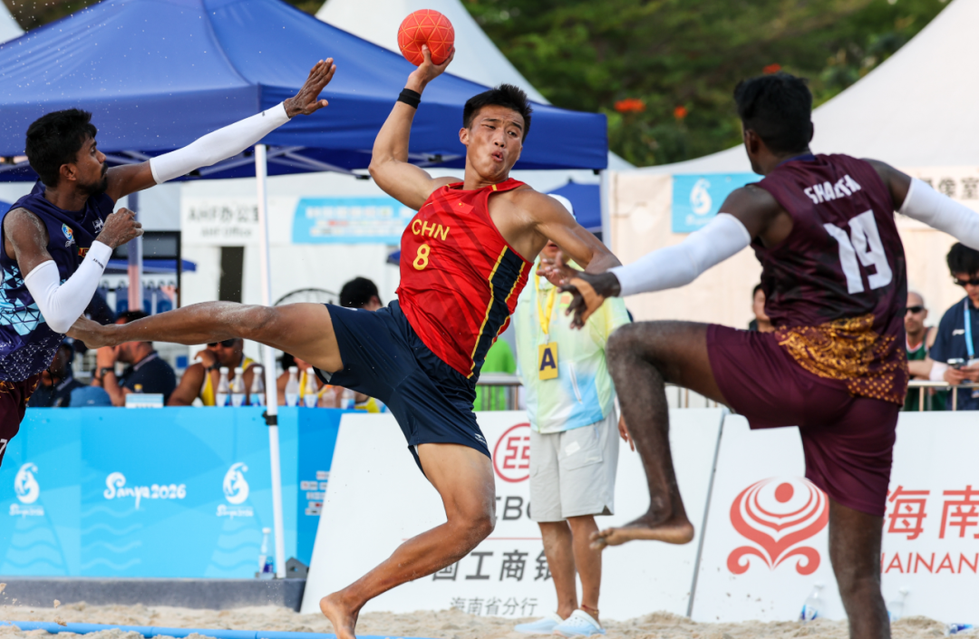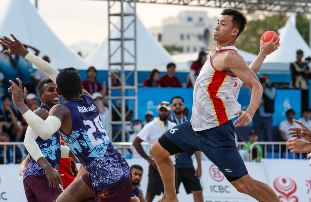 亞沙會沙灘手球比賽在三亞天涯海角競賽場館群東部的沙灘手球場進(jìn)行,中國男子沙灘手球隊(duì)首日迎來兩場預(yù)賽,先后對陣巴林隊(duì)和斯里蘭卡隊(duì),在中午進(jìn)行的與巴林隊(duì)比賽中,兩隊(duì)常規(guī)時間戰(zhàn)成14平,金球決勝階段,爭球后巴林隊(duì)獲得球權(quán),最后一攻完成得分。