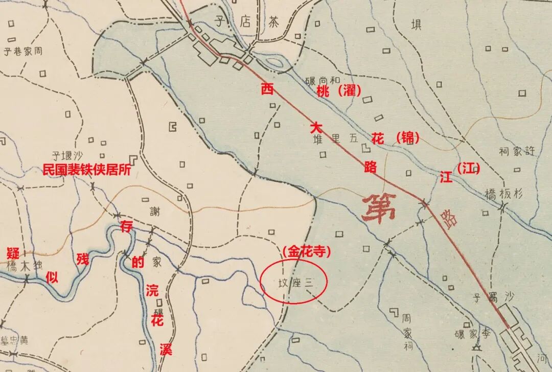 盧求《成都記》有“浣花溪正路金花寺”記錄,金花寺位于浣花溪的“正路”上。也就是說,找到了金花寺,就基本弄清了浣花溪的大概位置。巧的是,金花寺出土位置“三座墳”,剛好就落在桃花江南側(cè)不遠(yuǎn)處,這和歷史記載嚴(yán)絲合縫,即濯錦江與浣花溪的確是鄰近關(guān)系。