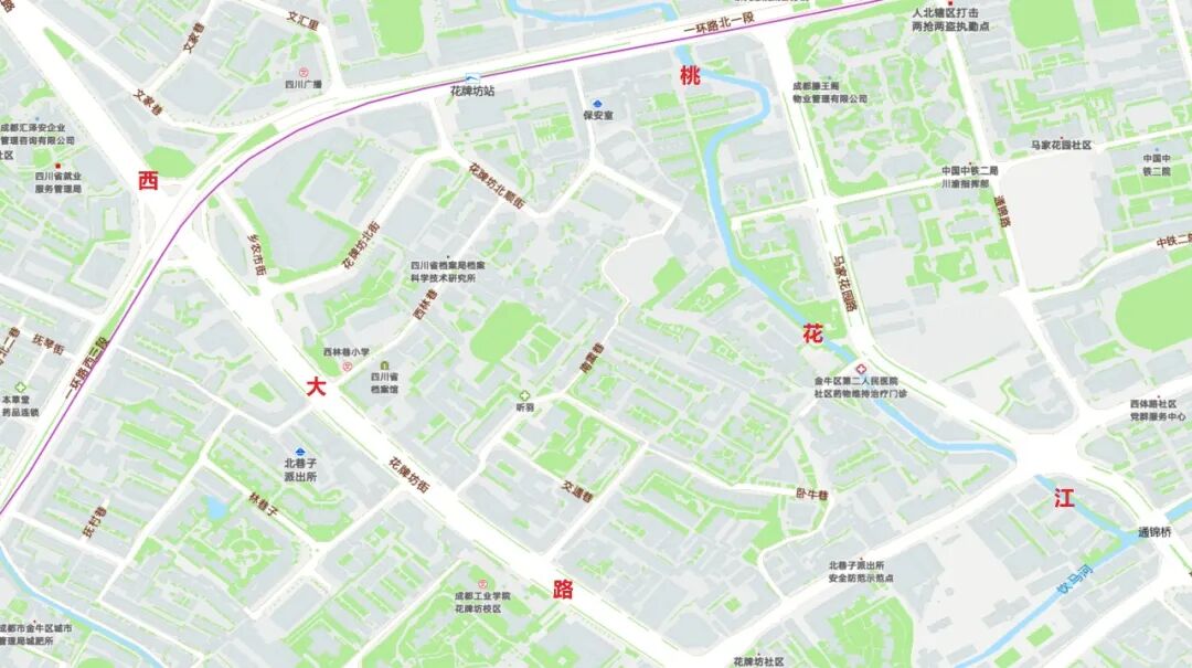 對比西大路附近的江流情況,可發(fā)現(xiàn)如今只有一條河流,即桃花江?,F(xiàn)在的桃花江,藏于都市之中,水流較小,很難讓人想象它那輝煌的過去。