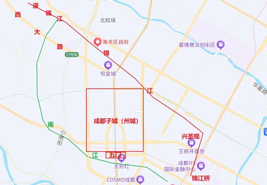 濯錦江,具有明確的指向性,其水道應(yīng)是從成都城西北方向的大西門附近開始,與西大路平行向西,通往犀浦方向。古籍里的記載有力證實(shí)了這條江的存在。北宋著名官員趙抃《成都古今記》中有:“濯錦江自州西北分派,東流至州北街,過入文富坊,東流至膠坊尾,又向南流于興圣觀,直東南至大慈寺前,有錦江橋是也。”這段話描述了濯錦江自成都城西北方向流入城內(nèi)的情況,該流不僅和西大路附近的濯錦江無縫對接,還說明了成都城內(nèi)“錦江”的來歷。
