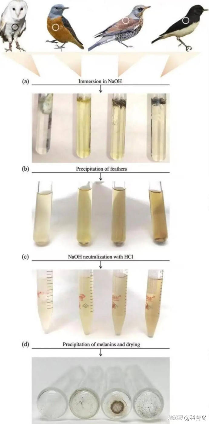 研究人員利用一種化學(xué)方法,用氫氧化鈉,也就是我們熟知的燒堿,將羽毛中的色素提取出來,再分別稱重,并與原始羽毛的重量進(jìn)行比較。