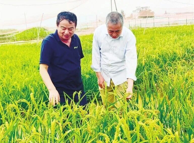 錢前(左)在觀察水稻長勢(shì)。圖源文明三亞微信公眾號(hào)
