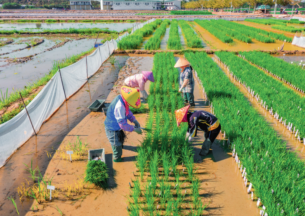 在三亞市崖州區(qū)壩頭南繁試驗(yàn)基地,農(nóng)民在插秧。圖源崖州灣科技城管理局