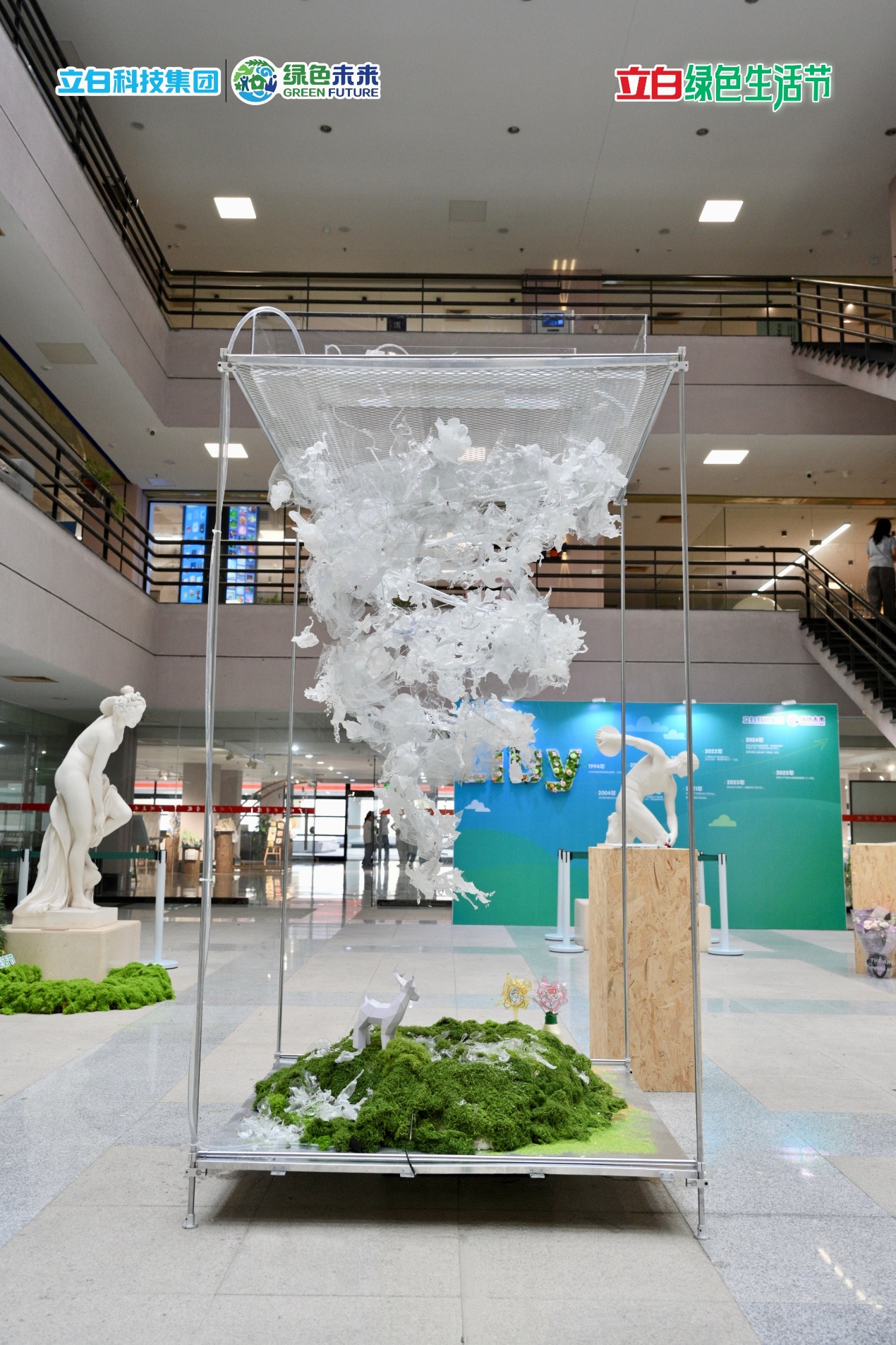 作為立白綠色生活節(jié)系列活動(dòng)之一,本次展覽由立白與廣美師生聯(lián)合打造,以包材循環(huán)再生為創(chuàng)作核心。廣美學(xué)子以立白產(chǎn)品包材等可循環(huán)材料為創(chuàng)作載體,完成從工業(yè)載體到藝術(shù)作品的價(jià)值煥新。其中核心作品之一的《源》以水循環(huán)為創(chuàng)作意象,融合透明包材打造光影交織的動(dòng)態(tài)空間,構(gòu)建出完整的自然生態(tài)閉環(huán),用藝術(shù)語(yǔ)言詮釋循環(huán)共生的可持續(xù)理念。