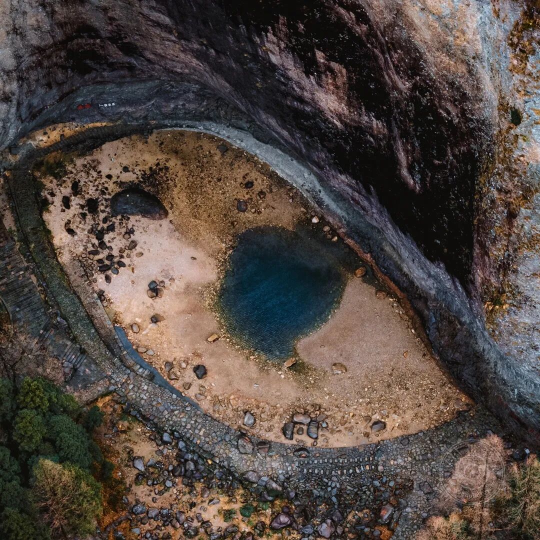 拍攝于浙江雁蕩山。高空俯瞰大龍湫干涸后的 “龍眼” 奇觀:丹霞巖壁如框,環(huán)抱著一汪幽藍(lán)潭水,恰似大山睜開的眼眸。砂石肌理與巖壁紋路在鏡頭下清晰呈現(xiàn),這是時(shí)光與水流鐫刻的大地印記,盡顯雁蕩山的自然變遷與造物之美。