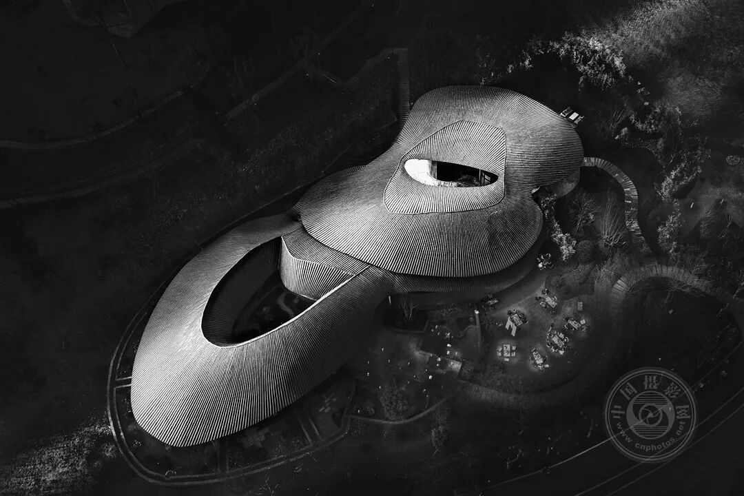 2025年2月3日拍攝于四川省德陽市中江縣凱州新城。作品以黑白航拍視角,展現(xiàn)城市中的獨(dú)特建筑之美。整體設(shè)計(jì)以四川“蓋碗茶”為靈感,將茶蓋、茶碗、茶托的經(jīng)典形態(tài)融入建筑造型,線條圓潤(rùn)流暢,極具地域文化內(nèi)涵。光影之下,青瓦肌理層次豐富,黑白影調(diào)更顯簡(jiǎn)潔雅致。庭院中的人影為建筑增添生活氣息,既傳承了川蜀茶文化底蘊(yùn),又在現(xiàn)代城市中營(yíng)造出一方靜謐雅致的飲茶空間,盡顯東方美學(xué)與市井煙火的相融共生。