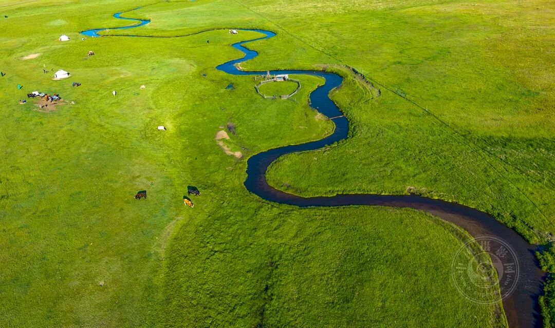 拍攝于錫林浩特,航拍視角綠色草原如巨型絨毯,藍(lán)色河流似靈動(dòng)絲帶,蒙古包、牲畜是神來點(diǎn)綴。色彩純粹到治愈,曲線河流寫滿自然詩意。