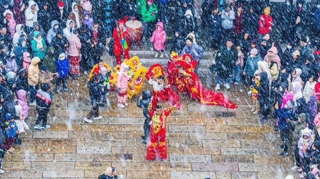 青島市即墨區(qū)古城,市民雪中舞獅鬧元宵。