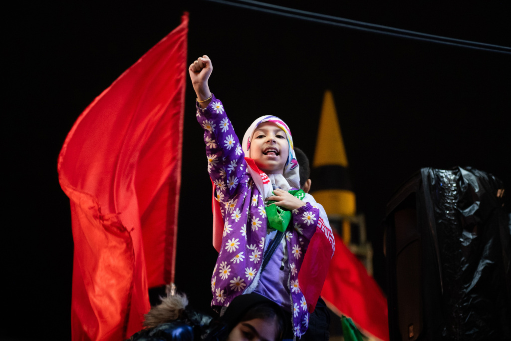 4月21日,伊朗德黑蘭,一名兒童在恩格赫拉布廣場(chǎng)集會(huì)中舉起拳頭。