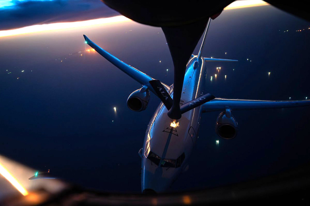 4月21日,伊朗霍爾木茲海峽附近,美國(guó)空軍KC-135“同溫層油船”加油機(jī)為一架P-8“海神”反潛巡邏機(jī)進(jìn)行空中加油。
