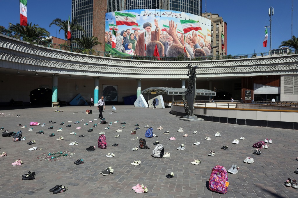 4月22日,伊朗德黑蘭,瓦利阿薩爾廣場(chǎng)上擺放著米納布學(xué)校遇襲女生的物品,后面是已故伊朗最高領(lǐng)袖哈梅內(nèi)伊的巨幅海報(bào)。