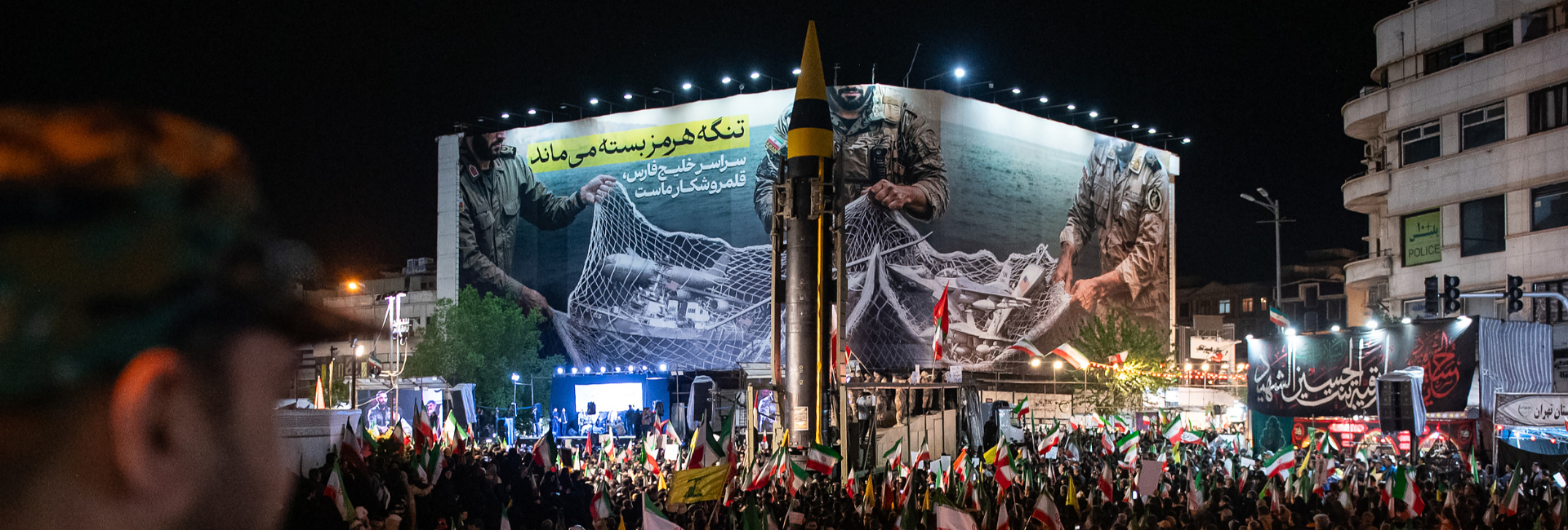 4月22日,伊朗德黑蘭,伊朗民眾走過(guò)革命廣場(chǎng),巨幅廣告牌寫著“霍爾木茲海峽仍將關(guān)閉”。當(dāng)日該地區(qū)處于?;馉顟B(tài)。