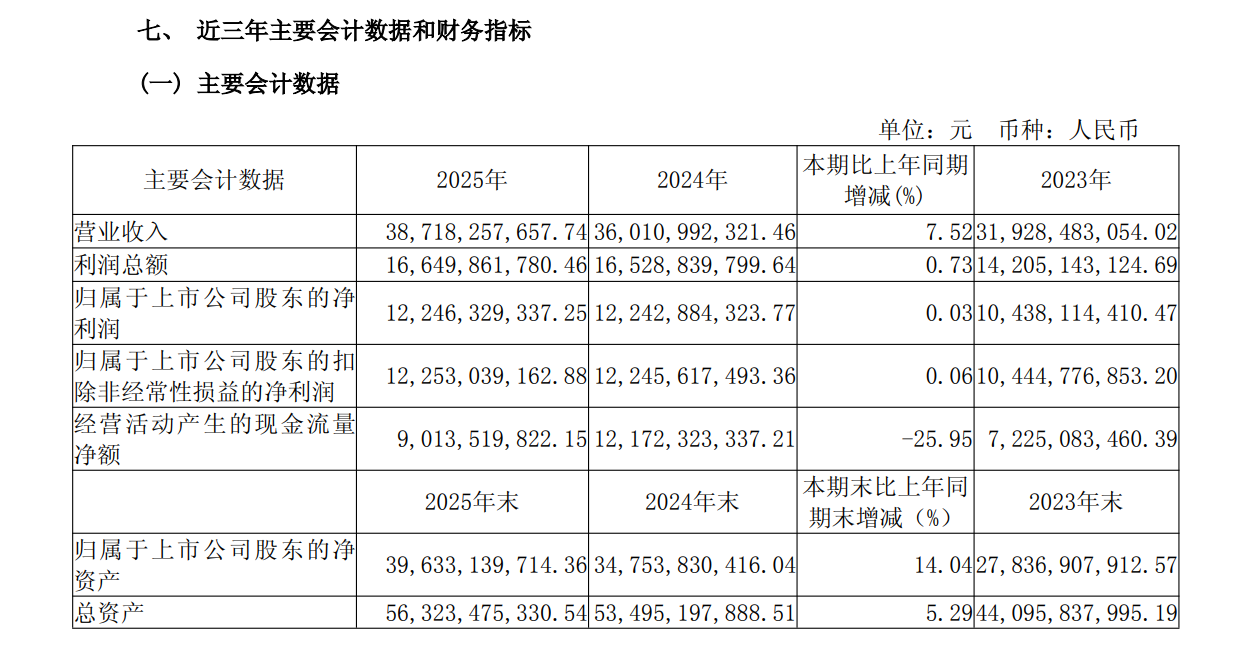 4月22日晚間,山西杏花村汾酒廠股份有限公司(山西汾酒,600809.SH)發(fā)布2025年年度報(bào)告,報(bào)告期內(nèi),公司實(shí)現(xiàn)營(yíng)業(yè)收入387.18億元,同比增長(zhǎng)7.52%;歸母凈利潤(rùn)122.46億元,同比增長(zhǎng)0.03%。公司擬向全體股東每10股派發(fā)65.60元現(xiàn)金股利(含稅),擬共計(jì)派發(fā)現(xiàn)金股利80.02億元。