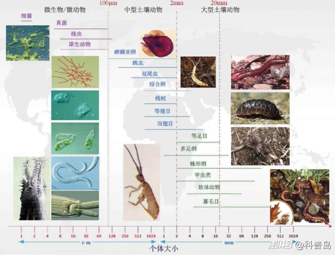 基于體寬大小的土壤動(dòng)物分類示意圖(圖片來(lái)源:中國(guó)土壤學(xué)會(huì))