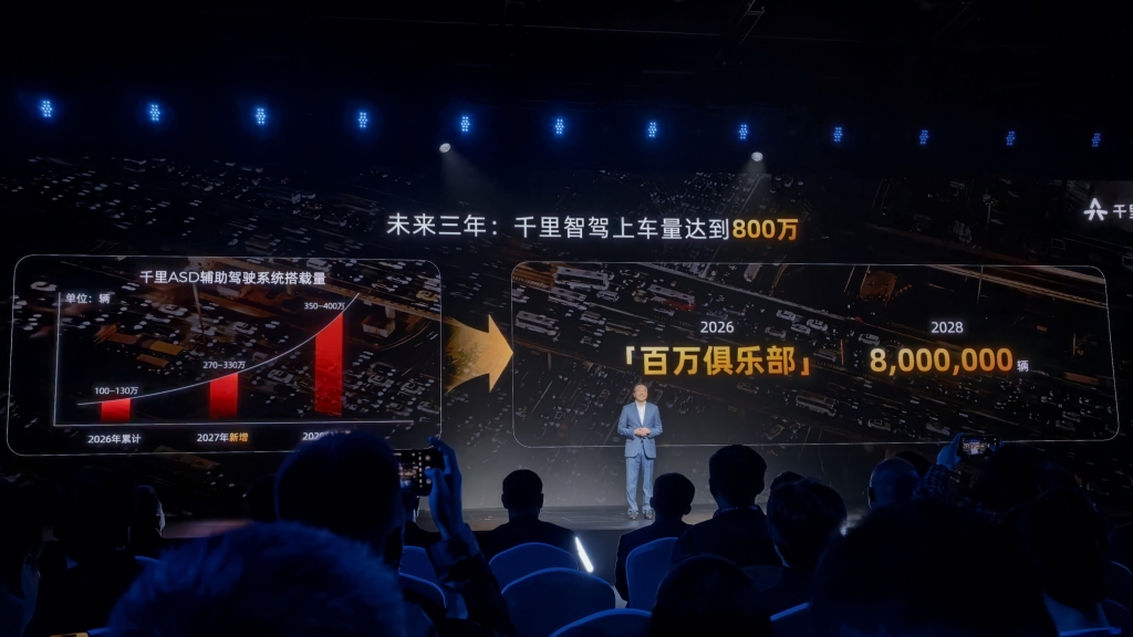 發(fā)布會現(xiàn)場,趙明拋出了千里科技的規(guī)模化目標:預計到2026年底,千里科技ASD輔助駕駛搭載量將達到100萬-130萬輛;到2028年,這一數(shù)字將挑戰(zhàn)800萬輛。