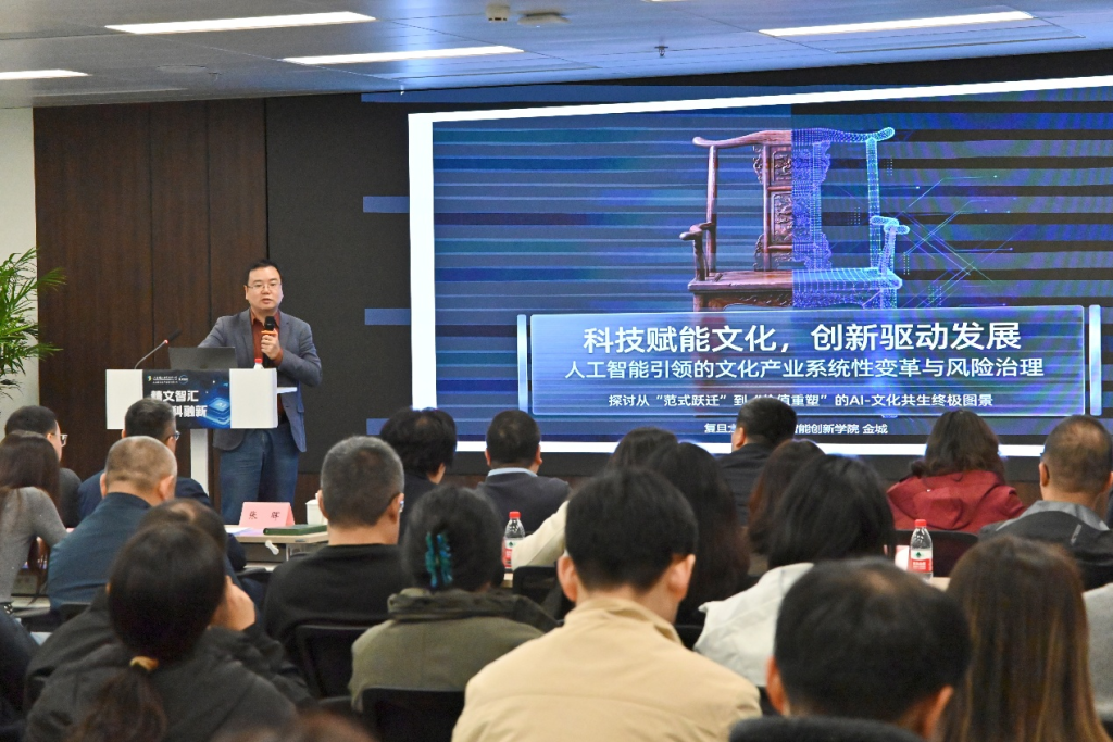 復旦大學計算與智能創(chuàng)新學院金城教授應邀作題為《人工智能引領的文化產(chǎn)業(yè)系統(tǒng)性變革與風險治理》的主題分享。從產(chǎn)業(yè)宏觀視角出發(fā),系統(tǒng)梳理了從AIGC到智能體媒體的范式躍遷,深入剖析影視重構、3D空間生成、非遺活化等核心賽道的發(fā)展趨勢,并探討AI時代人類基礎能力讓渡、審美同質化及版權博弈等深層隱憂,提出了從內容標識到利益重配的系統(tǒng)性治理框架。分享結束后,現(xiàn)場嘉賓與金城教授就相關問題進行了互動交流。