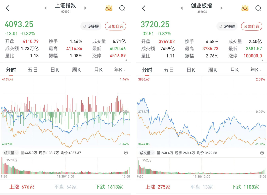 至收盤,上證綜指跌0.32%,報4093.25點;深證成指跌0.88%,報15043.45點;創(chuàng)業(yè)板指跌0.87%,報3720.25點。