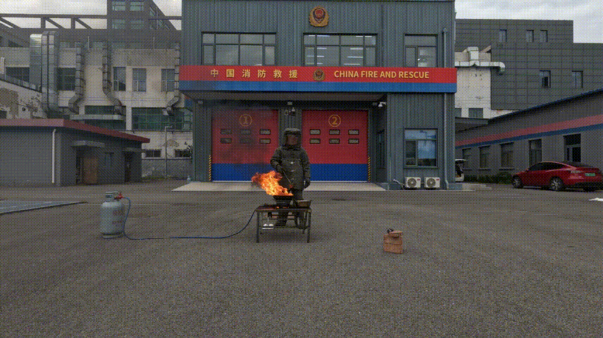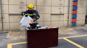 消防員在起火的油鍋中潑入冷水,火瞬間變大,事先放置的一雙拖鞋也被點(diǎn)燃。