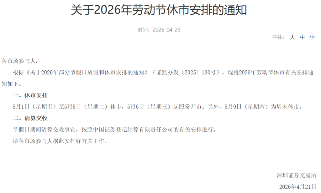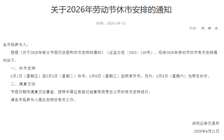 同日,深圳證券交易所也發(fā)布通知稱,根據(jù)《關(guān)于2026年部分節(jié)假日放假和休市安排的通知》(證監(jiān)辦發(fā)〔2025〕130號),2026年勞動節(jié)休市有關(guān)安排如下。