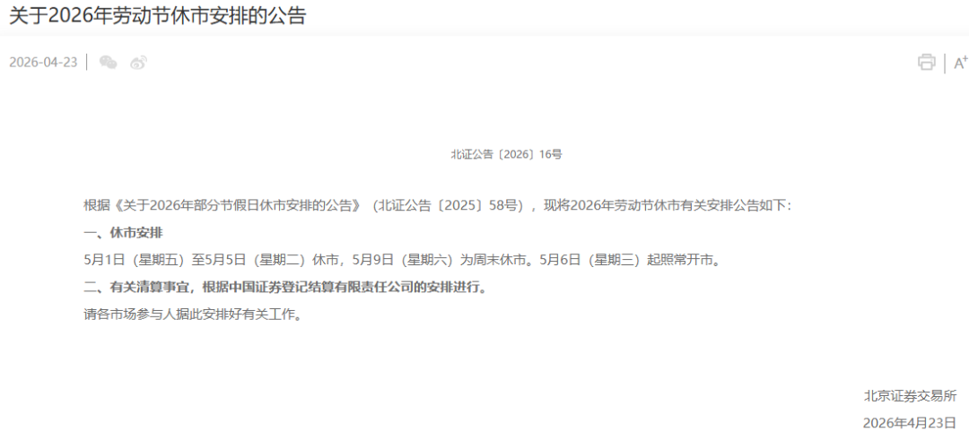 北京證券交易所4月23日也發(fā)布公告稱,根據(jù)《關(guān)于2026年部分節(jié)假日休市安排的公告》(北證公告〔2025〕58號),現(xiàn)將2026年勞動節(jié)休市有關(guān)安排公告如下: