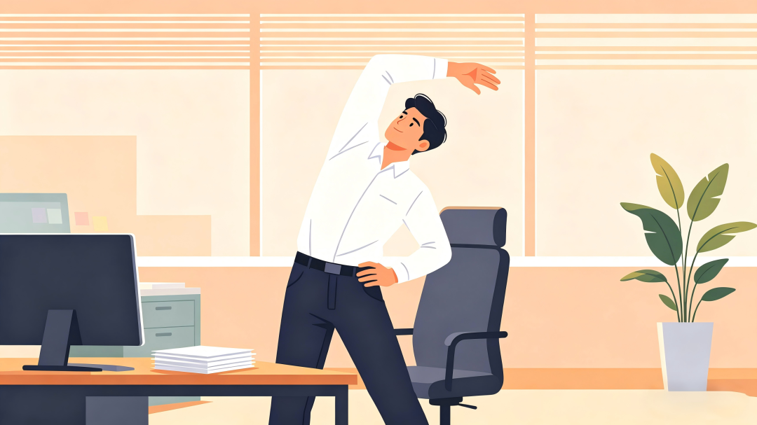1.每小時起身活動5分鐘:伸個懶腰、轉(zhuǎn)轉(zhuǎn)脖子、扭扭腰,讓緊張的肌肉放松一下。
