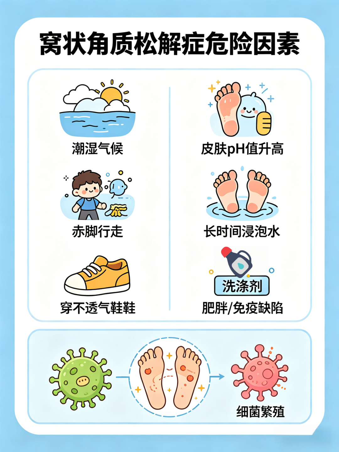 PK的危險因素包括潮濕的氣候、多汗癥、赤腳行走、穿不透氣的鞋子、皮膚pH值升高、腳部衛(wèi)生不良、長時間將手和腳浸泡在水和洗滌劑中、肥胖和/或免疫缺陷。這些危險因素使細菌在足部繁殖。