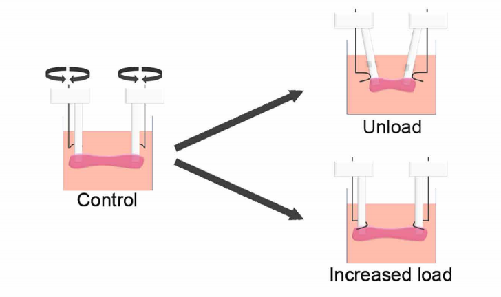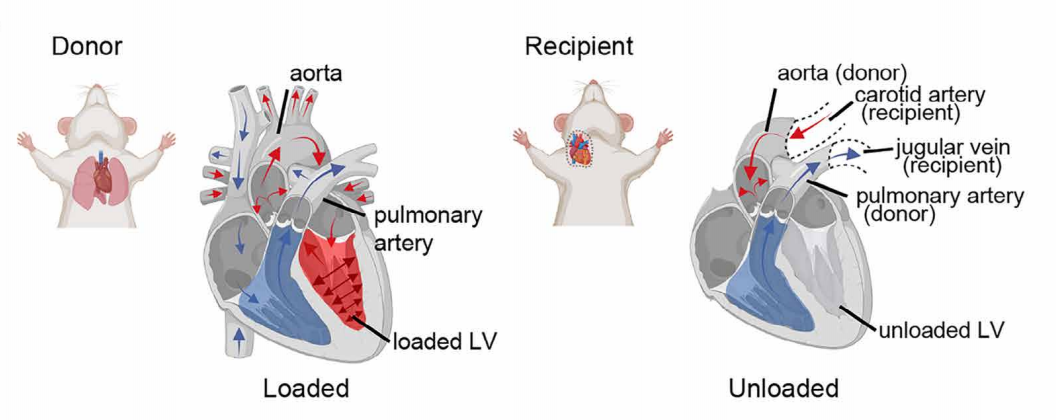 接下來,研究團(tuán)隊(duì)構(gòu)建了兩種模型,一種是“異位心臟移植”模型,將供體小鼠心臟移植到受體小鼠的頸部,使其恢復(fù)血液灌注但不承受泵血所產(chǎn)生的機(jī)械負(fù)荷。另一種是可精確控制機(jī)械負(fù)荷的“工程心臟組織”模型。