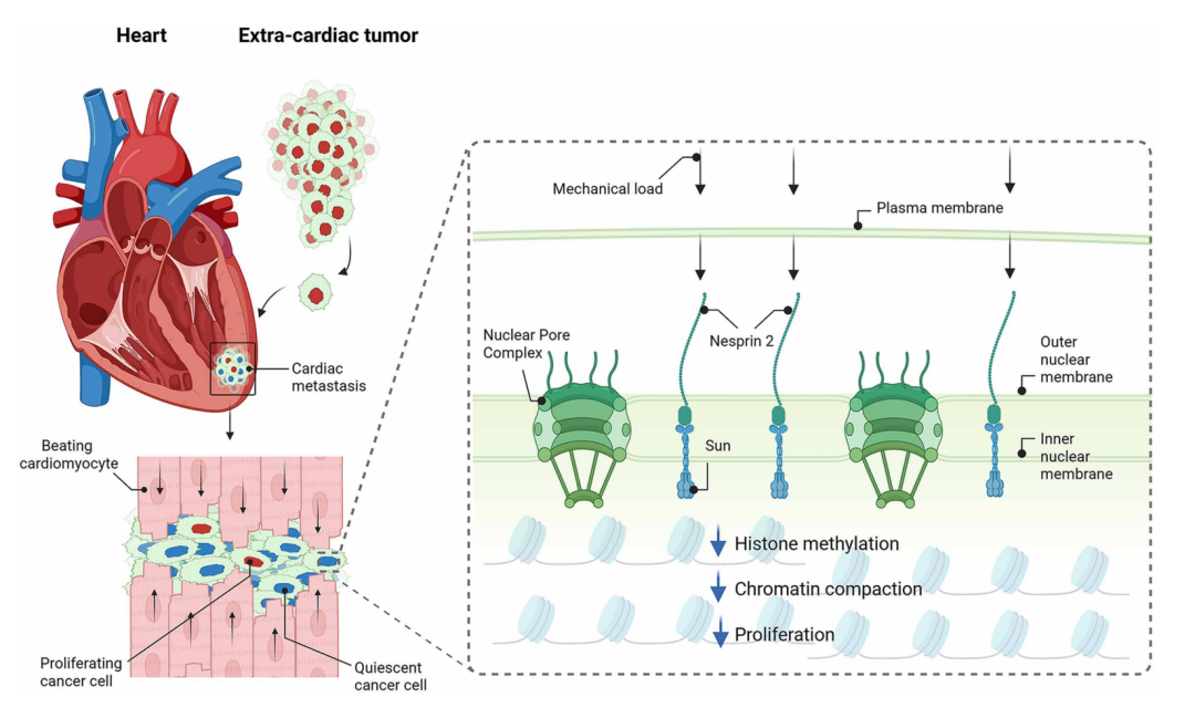 抑制心臟中癌細(xì)胞增殖的關(guān)鍵機(jī)制:植入心肌的癌細(xì)胞會(huì)受到心肌細(xì)胞收縮以及心臟跳動(dòng)產(chǎn)生的機(jī)械力的影響。Nesprin-2 是感知這些機(jī)械力的關(guān)鍵分子,從而導(dǎo)致癌細(xì)胞中組蛋白甲基化減少和染色質(zhì)松散,最終抑制癌細(xì)胞增殖。