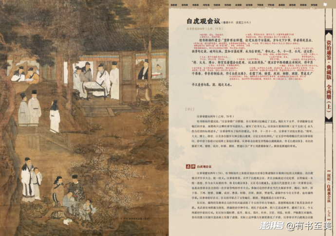 “白虎觀會議”配的是宋代《洛陽耆英會》卷,描繪了十三名士聚會議事場景,還是司馬光親自作序的。