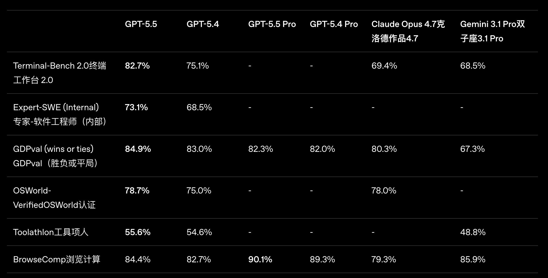 所以不出意外,圍繞「聊天」的各項(xiàng)能力就沒(méi)那么重點(diǎn)了,圍繞「工作」來(lái)講才是王道。而從紙面參數(shù)和 benchmark 看,GPT-5.5 的確延續(xù)了 OpenAI 過(guò)去半年的技術(shù)路線,更多以「真實(shí)工作場(chǎng)景」為導(dǎo)向,在一些取向更貼近實(shí)際的基準(zhǔn)測(cè)試中又刷了新高,比如: