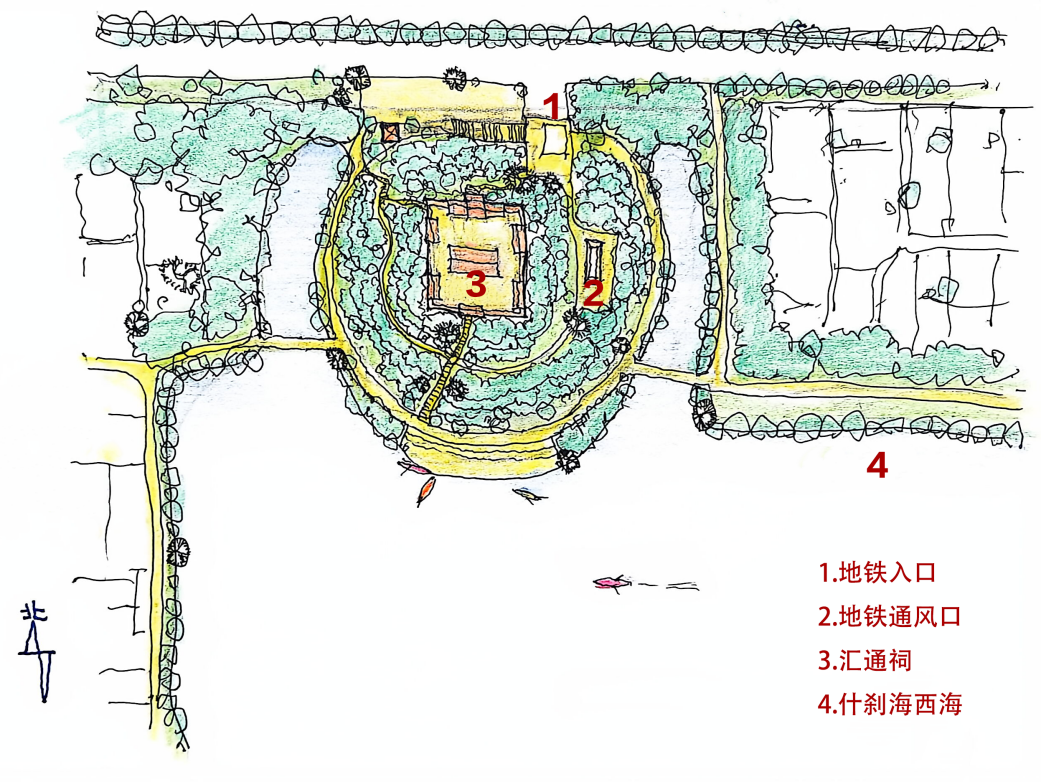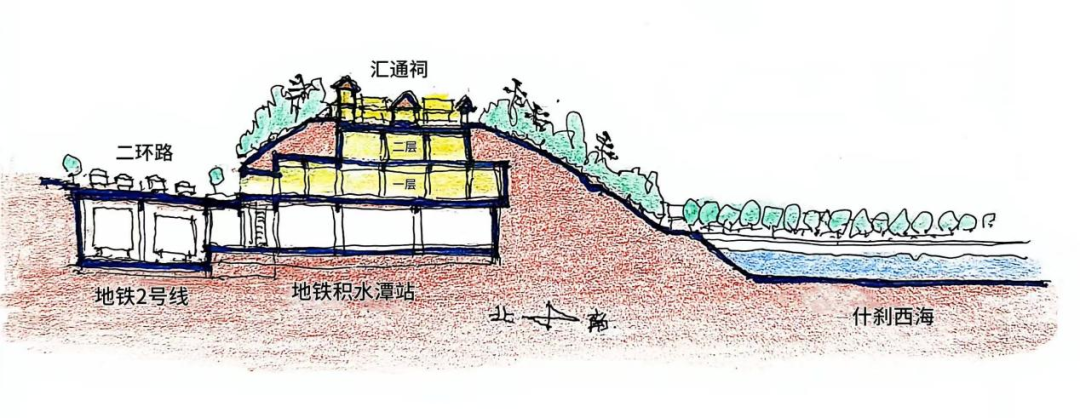 鄭光中的方案是在地鐵的頂板上建造一個(gè)兩層的建筑。這兩層建筑外包泥土和山石,堆成一座小山,山上植樹種草,并在此建筑之上修建匯通祠。這樣就在山內(nèi)建成了一個(gè)不小的公共空間,也為匯通祠的建設(shè)打好了堅(jiān)固的基礎(chǔ)。