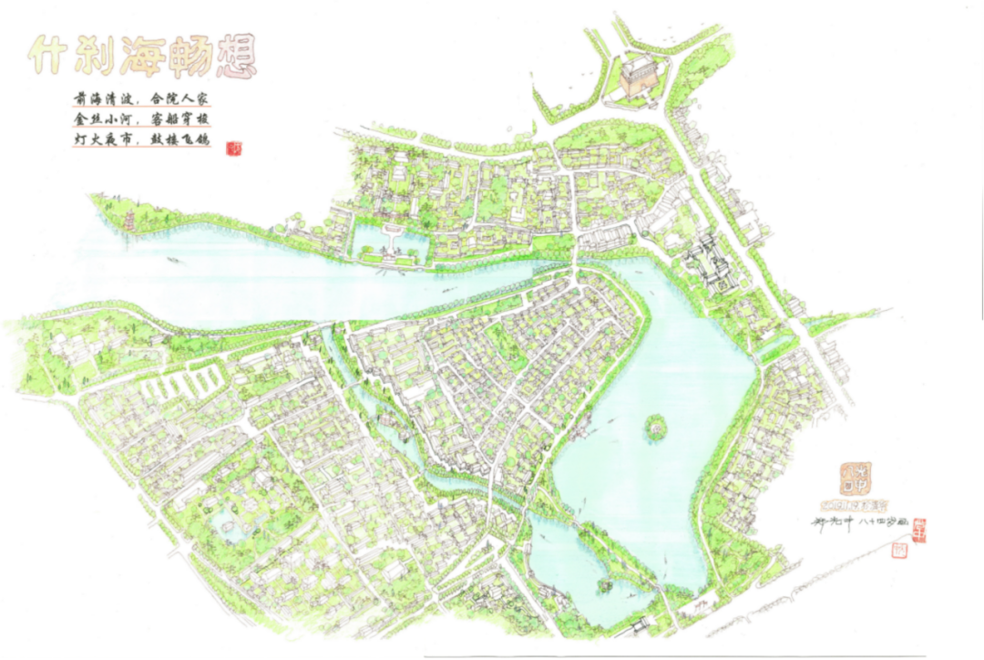 “我當(dāng)時(shí)也沒有想到,什剎海的規(guī)劃一做就是幾十年。為什么一直是我們做呢?因?yàn)槲覀兒臀鞒菂^(qū)政府的合作很有成效,而且我們工作很認(rèn)真,也拿了不少獎(jiǎng)項(xiàng)。”鄭光中告訴記者,“我畫這張圖時(shí)已經(jīng)退休很久了,但是依然牽掛著這里。什剎海還有很多可以改進(jìn)的地方,我已經(jīng)干不動(dòng)了,希望后來人能把這些暢想做下去?!?/p>