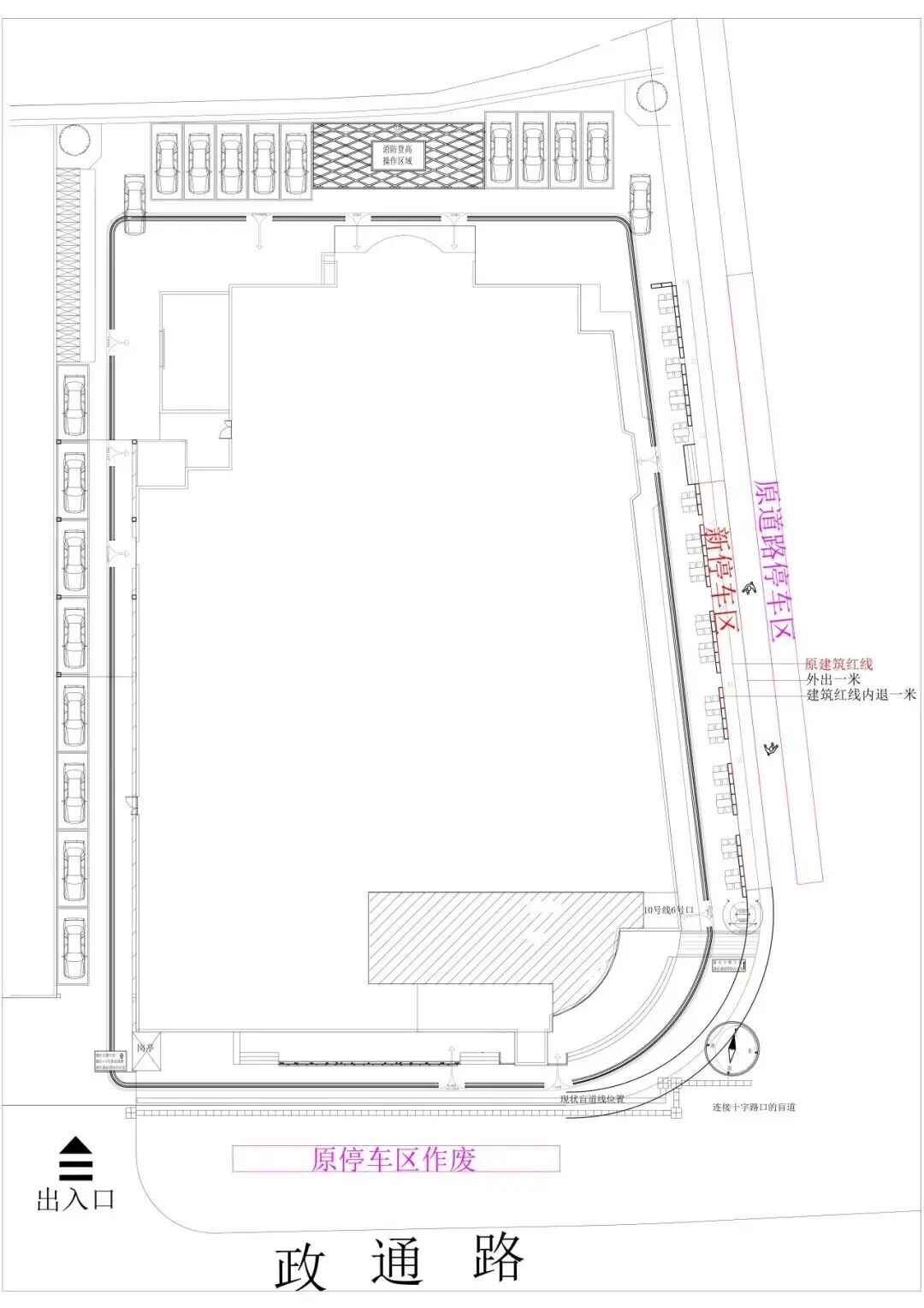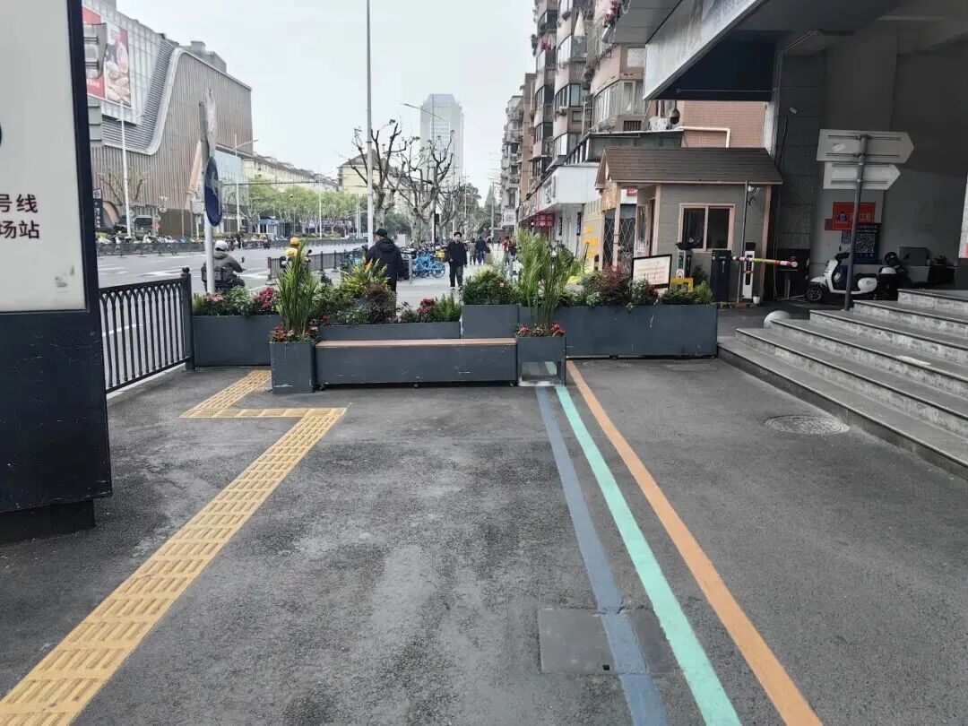 在充分調(diào)研的基礎(chǔ)上,一套“疏堵結(jié)合、內(nèi)外兼修”的改造方案逐漸成形。一方面向內(nèi)“挖潛”,將商廈淞滬路一側(cè)的外擺位后撤1米,騰出空間給非機(jī)動(dòng)車停放,另一方面向外“設(shè)防”,在政通路人行道加裝兼具美觀與實(shí)用功能的隔離花箱,以及定點(diǎn)“疏導(dǎo)”,在通道內(nèi)劃定外賣小哥專用停車區(qū),實(shí)現(xiàn)分類停放。